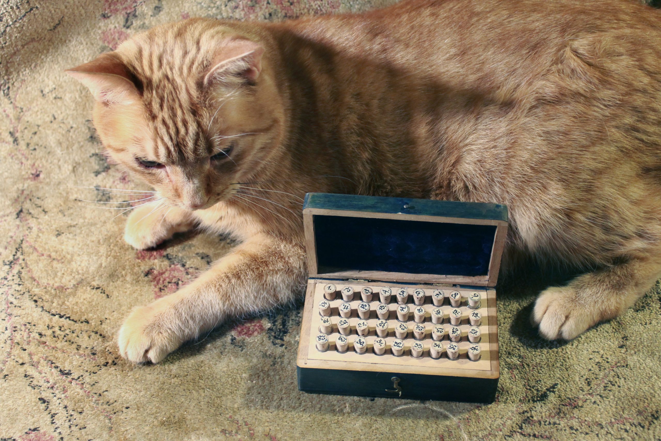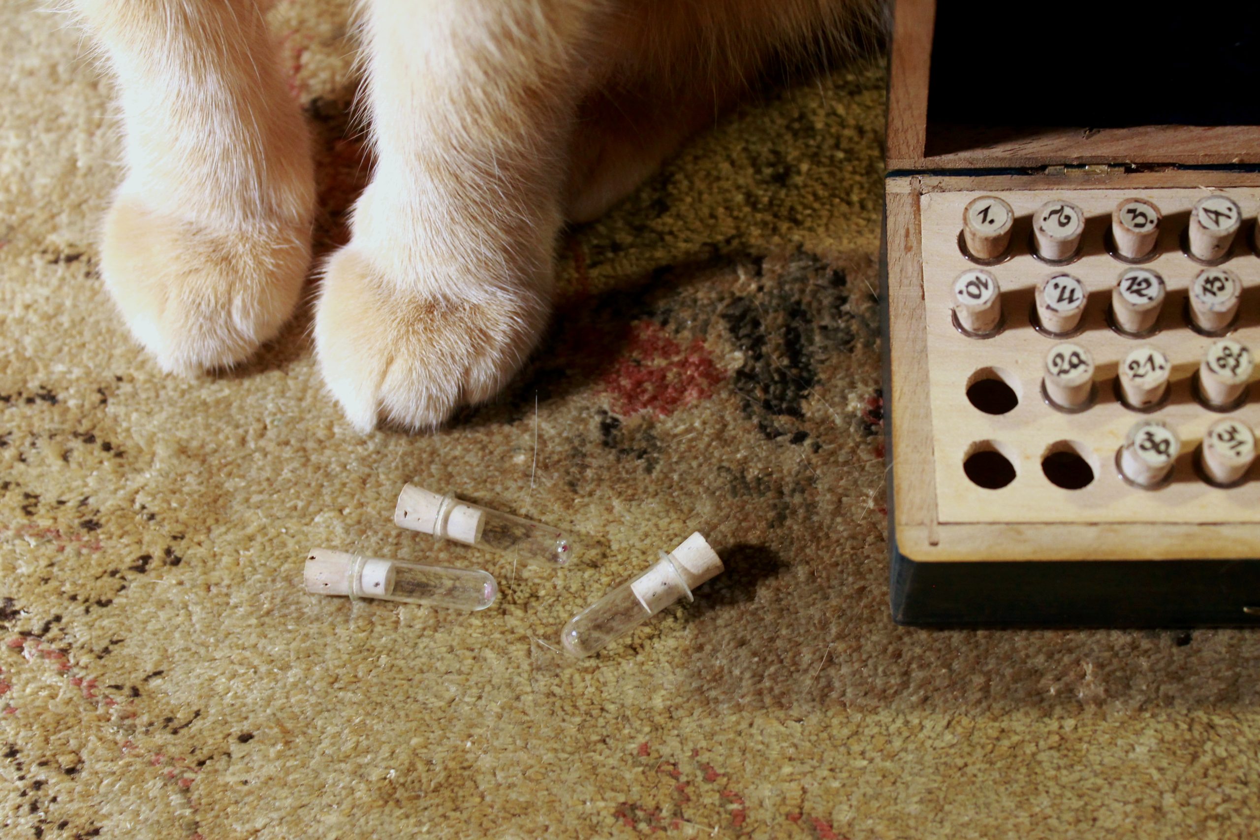 vintage wooden watchmaker case with tiny test tubes.
